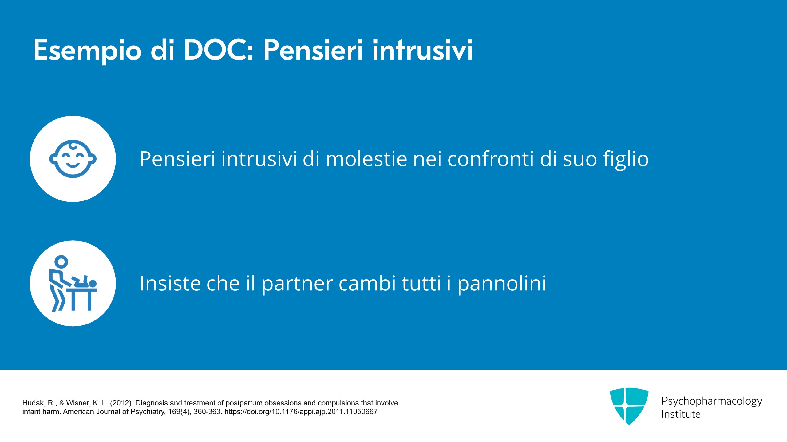 I pensieri intrusivi di fare del male al bambino sono estremamente comuni nel DOC post-partum, ma in realtà non indicano un rischio elevato di fare del male al bambino perché i pensieri sono terrificanti per la paziente, sono ego-distonici e la madre non ha maggiori probabilità di fare del male al bambino rispetto a chi non ha questi pensieri. Detto questo, però, è molto importante assicurarsi che si tratti effettivamente dei pensieri intrusivi del DOC e non dei deliri della psicosi post-partum. Le donne con psicosi post-partum hanno un rischio elevato di fare del male ai propri figli. È quindi molto importante fare questa distinzione.