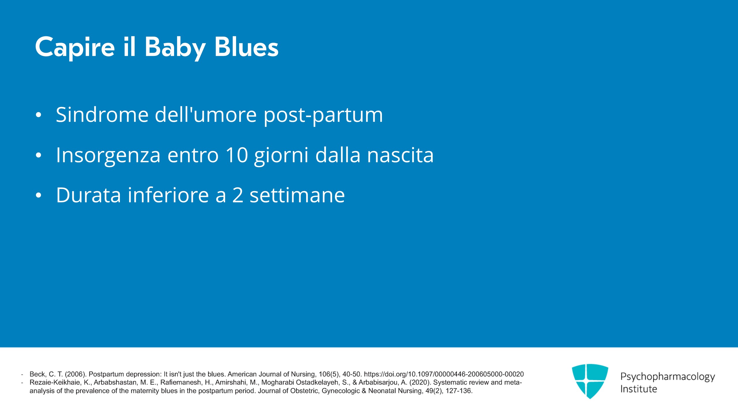 - Il postpartum blues è una sindrome dell’umore, non una malattia psichiatrica, con esordio di solito entro 10 giorni dal parto e durata di 2-3 giorni.